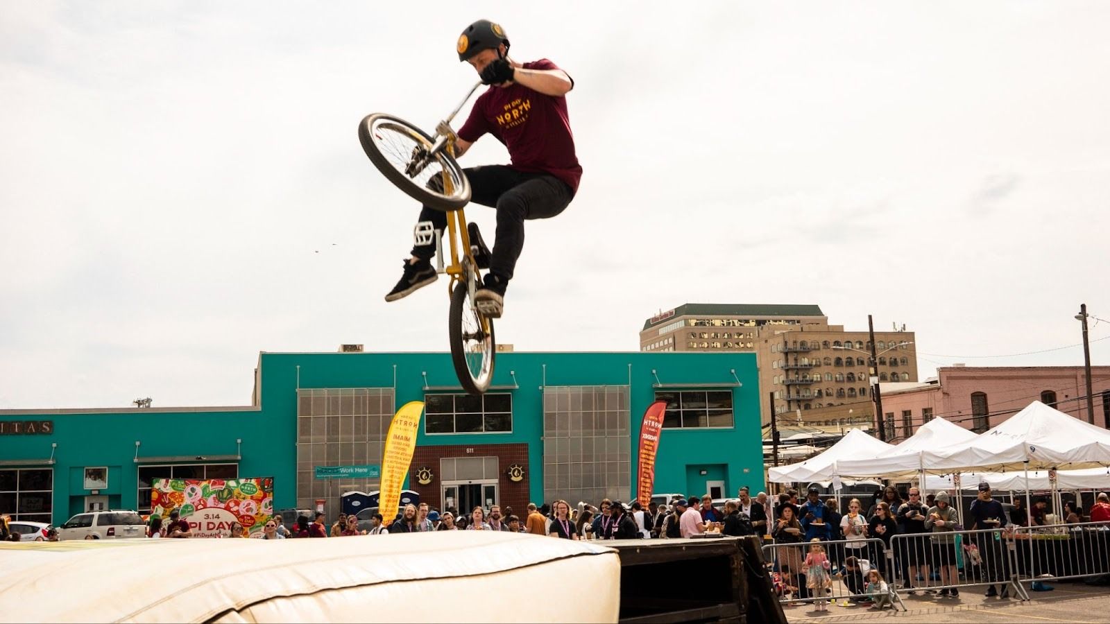 Our original Vespa stunt show got scrapped when the weather forecast turned gnarly, so we pivoted to a BMX stunt show inside a circular cage we branded the “Globe of Dough.”