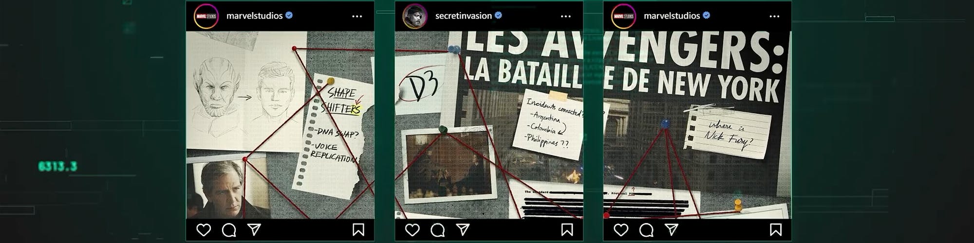 We built out an in-world “detective board” packed with Easter eggs connecting Secret Invasion to the larger MCU for fans to speculate around. We designed the board as an interconnected Instagram grid. And in the middle of the board, we hid the password to a website containing the first 5 minutes of the show. If you’re a Marvel fan, our grid had all the secrets you were dying to see.